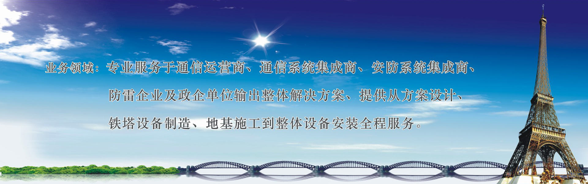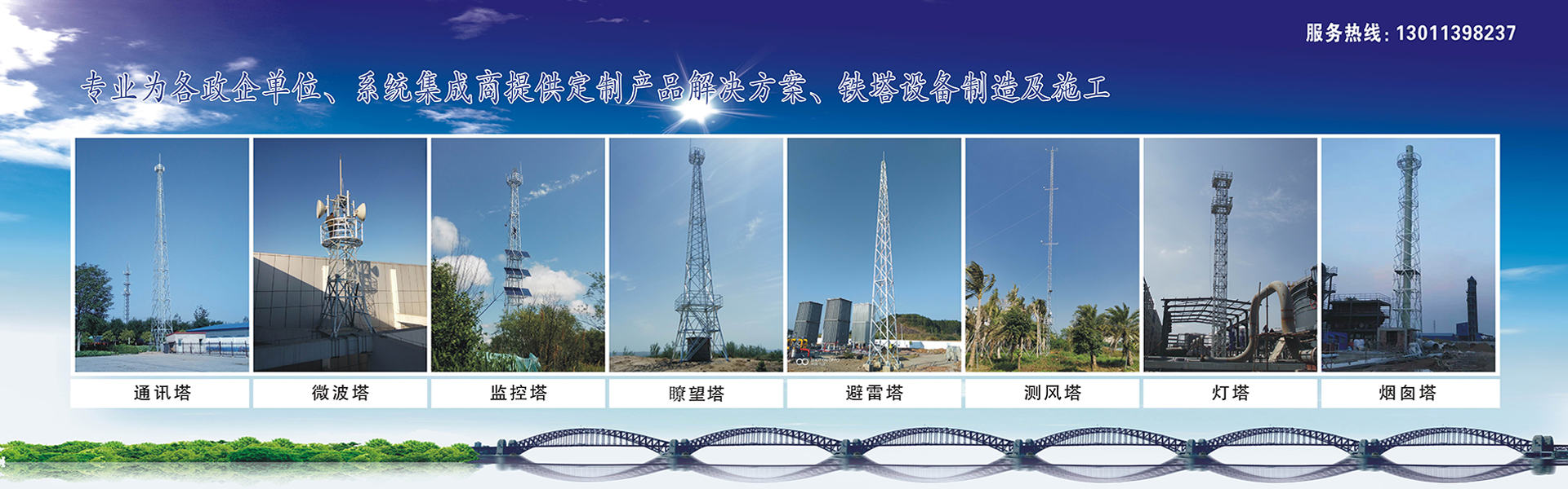 公司產品為微波通訊鐵塔、廣播電視塔、GFL(GFW,GH)避雷塔、GJT避雷針、測風塔、拉線塔、監控塔、通量監測塔、不銹鋼塔、屋頂網架、天線支臂(架)、走線架、監控桿等鋼結構產品。公司對外承接通信鐵塔維修保養、代理維護、鐵塔防腐、地基加固、防雷接地檢修及整改、通信天線安裝、雷達設備安裝、風光互補供電設備安裝、自動氣象站設備安裝、機房設備安裝及通用設備高空作業等業務、服務范圍覆蓋全國。